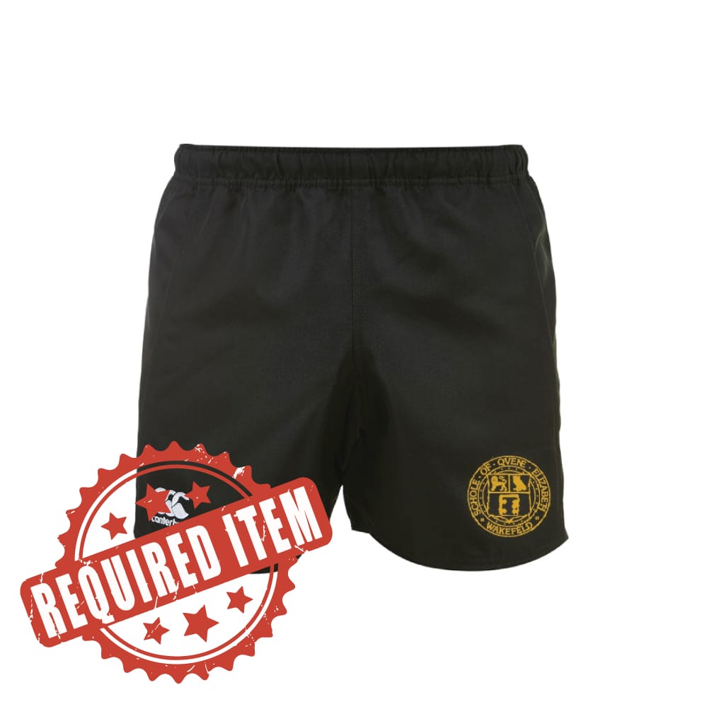 REQUIRED ITEM — QEGS Games Short (Advantage) by Canterbury. Please see SIZE GUIDE in MORE GARMENT VIEWS. The Advantage Short combines strength, durability and comfort, giving a update to the traditional playing and training rugby short. The stretch gusset and stretch insert panels to side legs allow freedom of movement; while the elasticated waistband has an internal drawcord. The Canterbury logo has been embroidered for a classic finish.